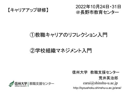 【研修講師】「学校組織マネジメント入門(キャリアアップ研修)@長野市教育センター 2022年10月31日、先週の10月24日に引き続いて、長野市の中堅教員(主に40代の教員)を対象としたキャリアアップ研修をさせていただきました。 1日目では、「教職キャリア…